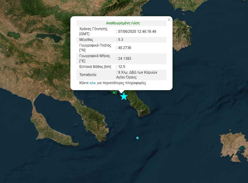 Во морскиот дел на девет километри северозападно од Кариес на Света Гора на третиот крак на Халкидики, кусо пред 16 часот по локално време беше регистриран земјотрес со јачина од 5,3 степени, по кој следуваа серија земјотреси со помал интензитет.