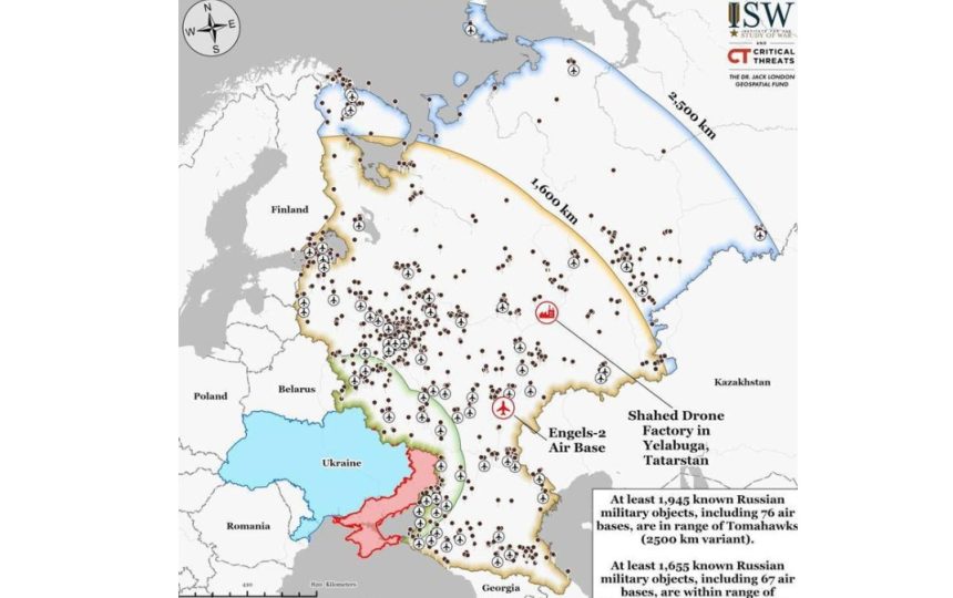 Речиси 2.000 рафинерии во Русија ќе бидат мета, ако Украина ги добие ракетите „Томахавк“ со долг дострел од САД, анализира познатиот Институт за проучување на војната во САД (ИСВ). На мапата која ја објави Институтот, означени се сите руски воени и безбедносни објекти што би можеле да влезат во дострелот на овие ракети.