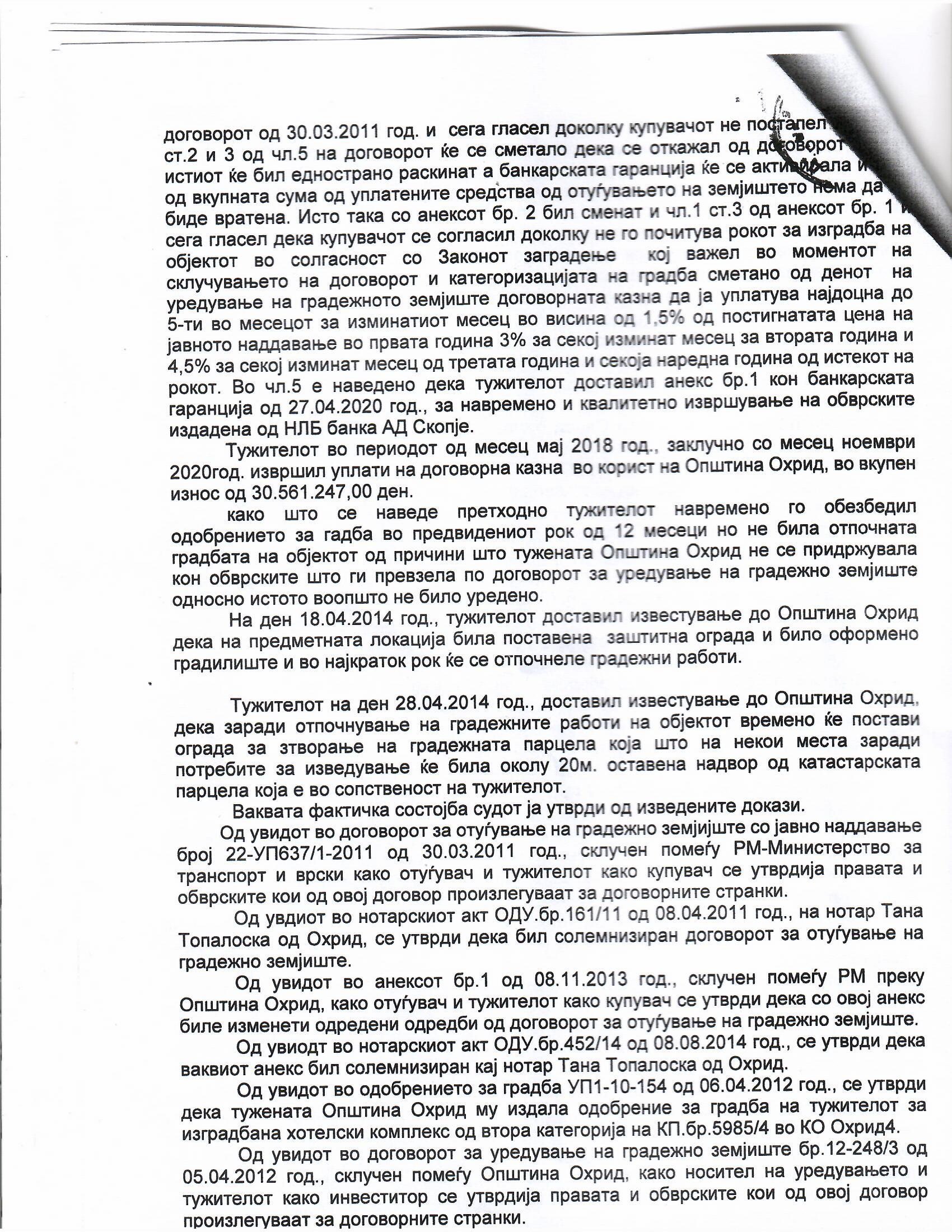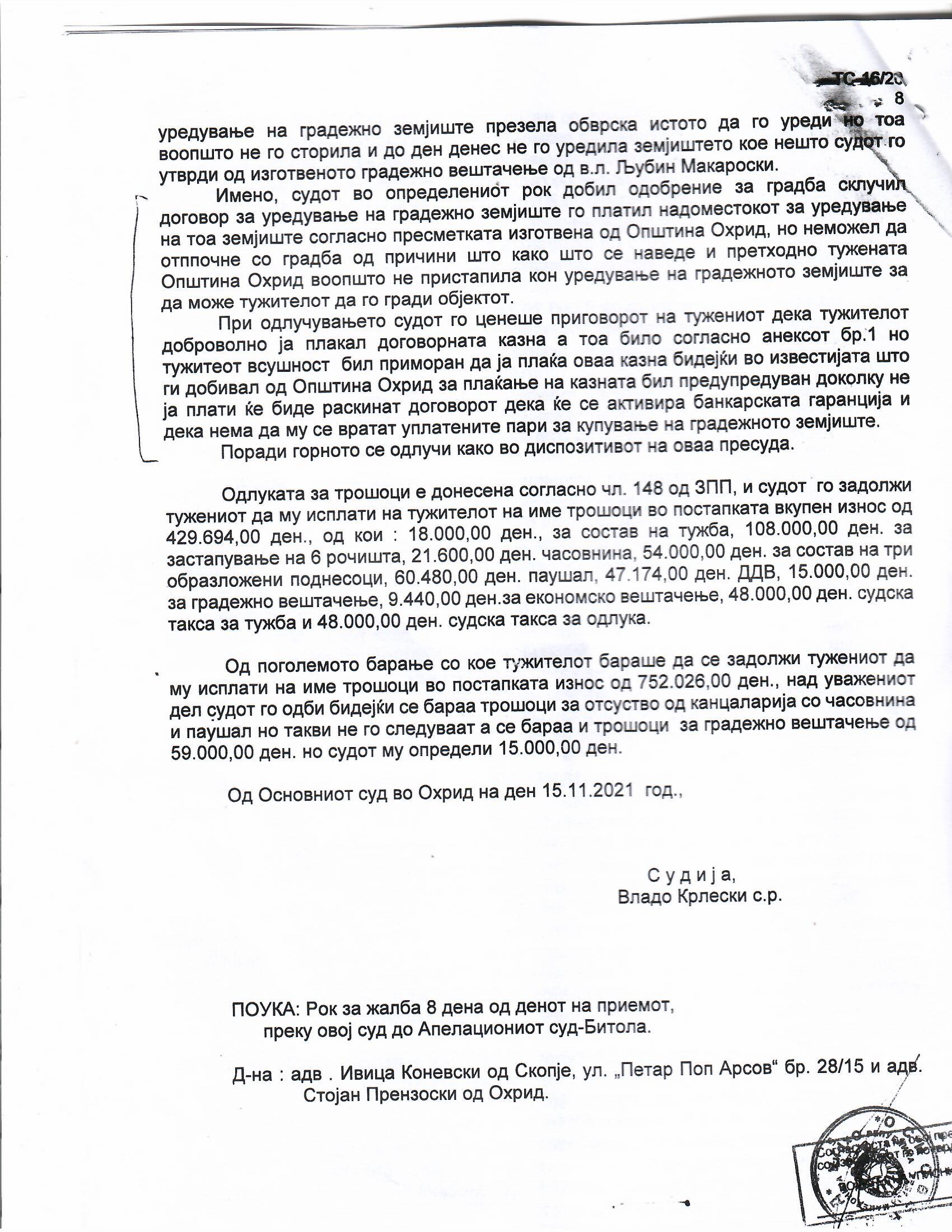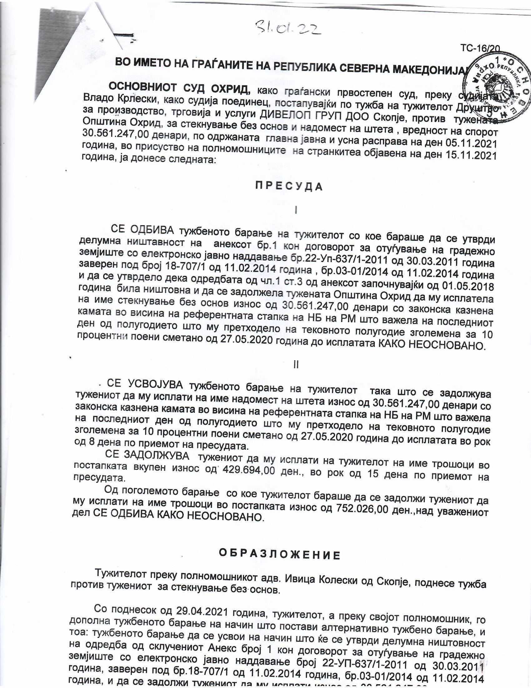 Судијата при Основен суд Охрид Владо Крлевски , без око да му трепне ,носи пресуда на ден 15-11-2021 година, во корис на „Дивелоп груп“,и ја задолжува Општина Охрид да му ислпати на „Дивелоп груп“ износ од 30.561.247,оо денари со законска затезна камата од 10% ,зголемена за 10 процентни поени сметано од 27-05-2020 година во рок од 8 дена каком и износ од 429.694,оо денари на име на адвокатски трошоци на Адв Ивица Коневски!