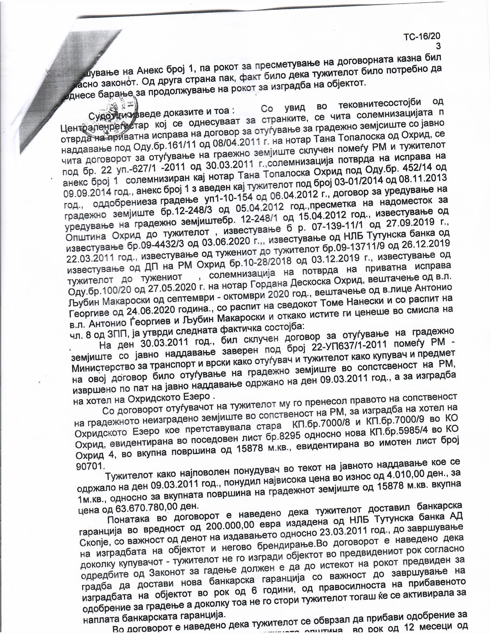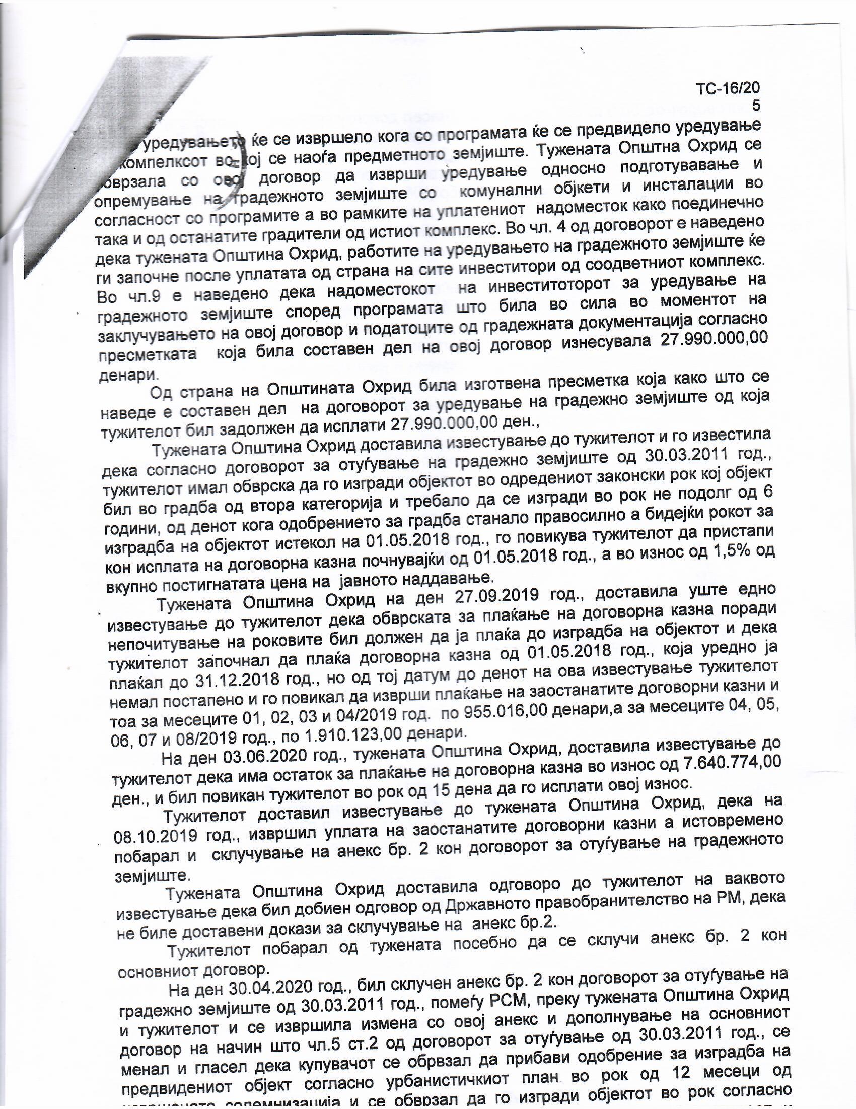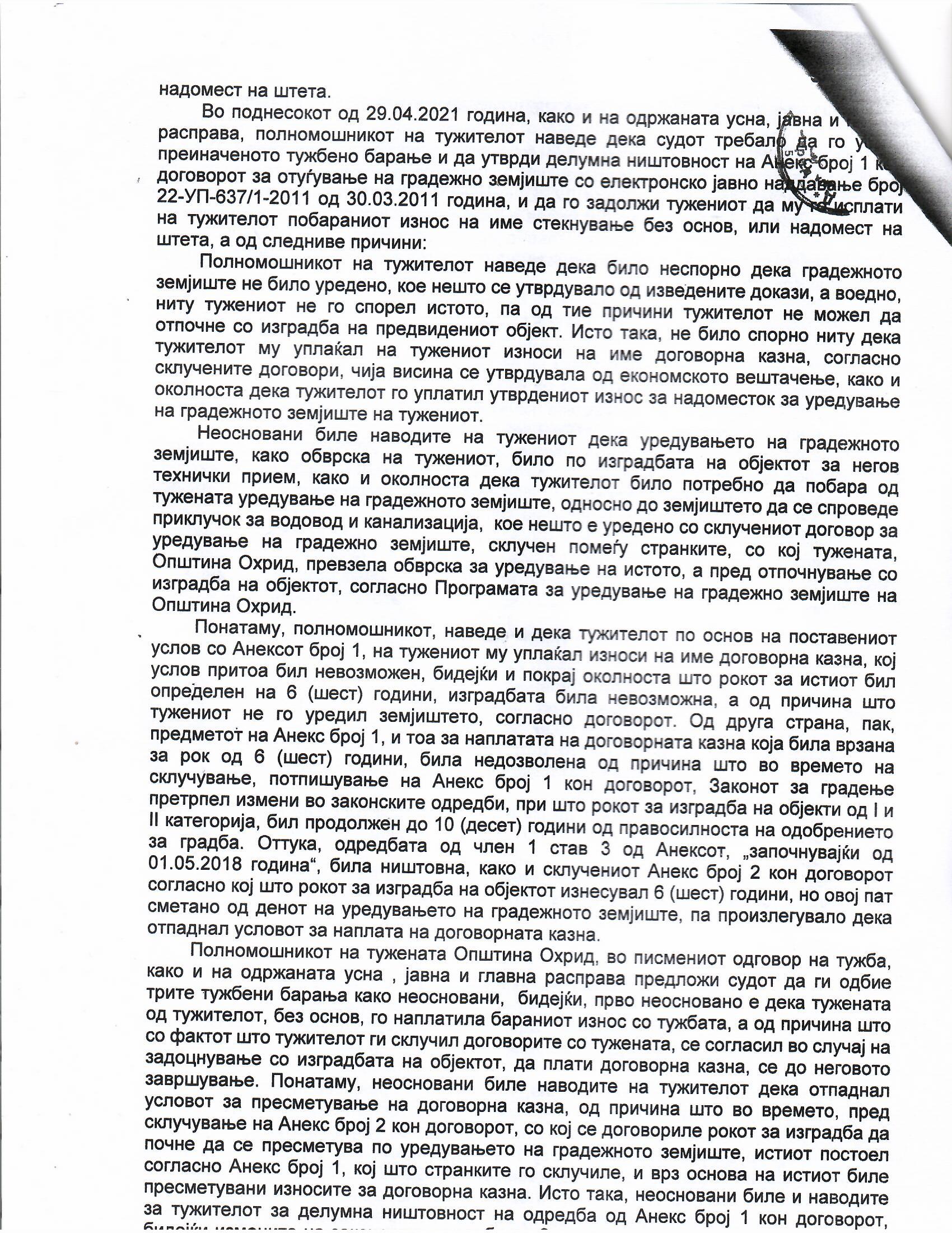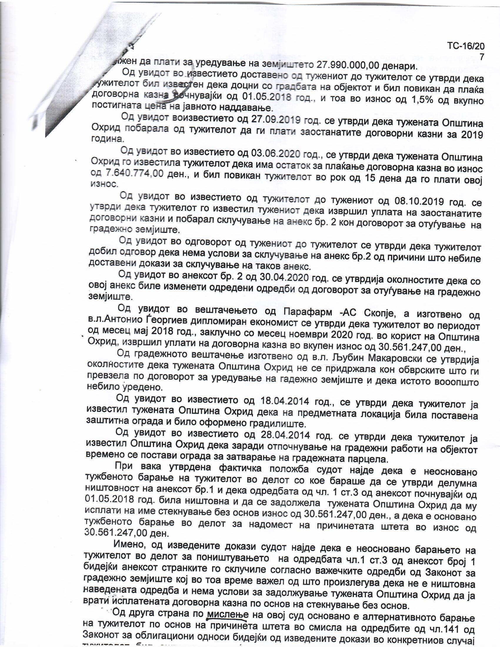 Судијата при Основен суд Охрид Владо Крлевски , без око да му трепне ,носи пресуда на ден 15-11-2021 година, во корис на „Дивелоп груп“,и ја задолжува Општина Охрид да му ислпати на „Дивелоп груп“ износ од 30.561.247,оо денари со законска затезна камата од 10% ,зголемена за 10 процентни поени сметано од 27-05-2020 година во рок од 8 дена каком и износ од 429.694,оо денари на име на адвокатски трошоци на Адв Ивица Коневски!
