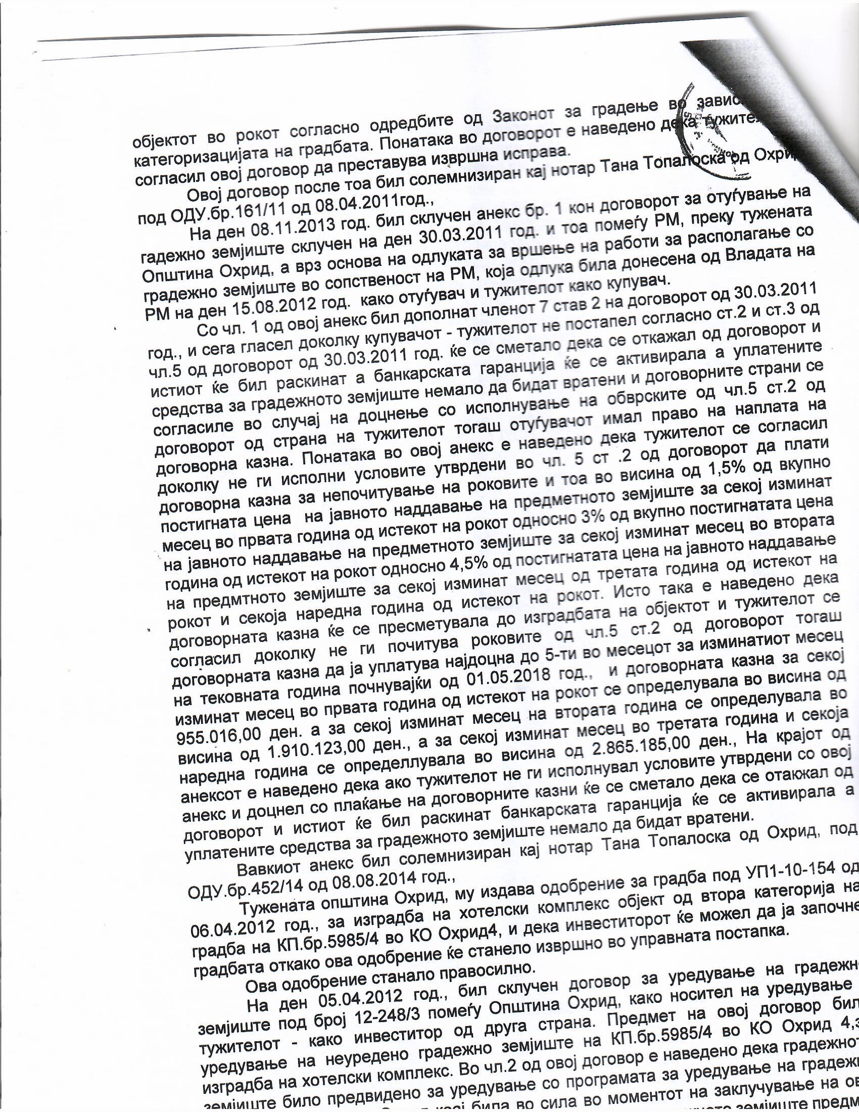 Тогаш на барање на „Дивелоп груп“ Општина Охрид склучува Анекс на договор кој се солемизира кај овластен Нотар во Охрид , со кој анекс на договор „Дивелоп груп“ се обвзува да плати Пенали на име на каснење на градежните активности и се обврзува дека истите ќе бидат завршени до 2020 година?