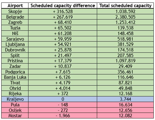 За првиот квартал од 2026 година скопскиот аеродром нуди 316.528 повеќе седишта споредено со истиот квартал од 2025 година, што го прави апсолутен лидер во регионот. Зад Меѓународниот аеродром Скопје е аеродромот со Белград со 267.000 повеќе седишта или 100.000 помалку од Скопје, а далеку зад скопскиот аеродром е аеродромот во Загреб со само 68.000 повеќе понудени седишта во првиот квартал во 2026 година.
