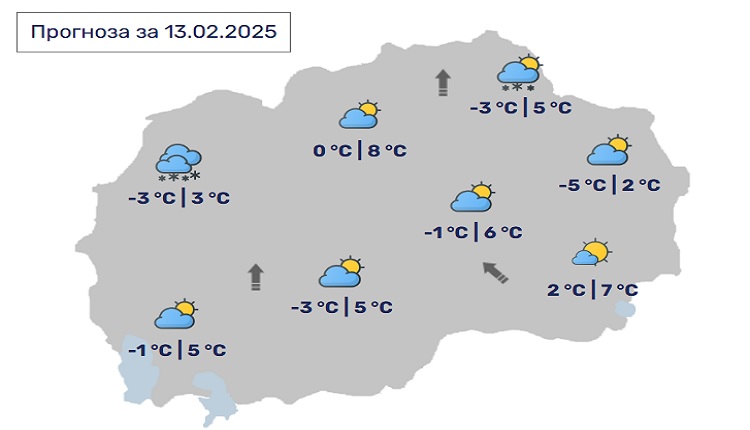 Температурите ќе се движат во рамки на сезонските просеци, со најниски утрински вредности околу нулата, додека дневните ќе се искачат до неколку степени над неа.