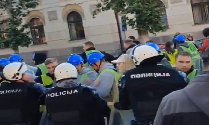 Пред зградата на судот и обвинителството во Нови Сад, пред осум часот утрово, имаше турканица со полицијата која се обидуваше да им овозможи на вработените да влезат.
