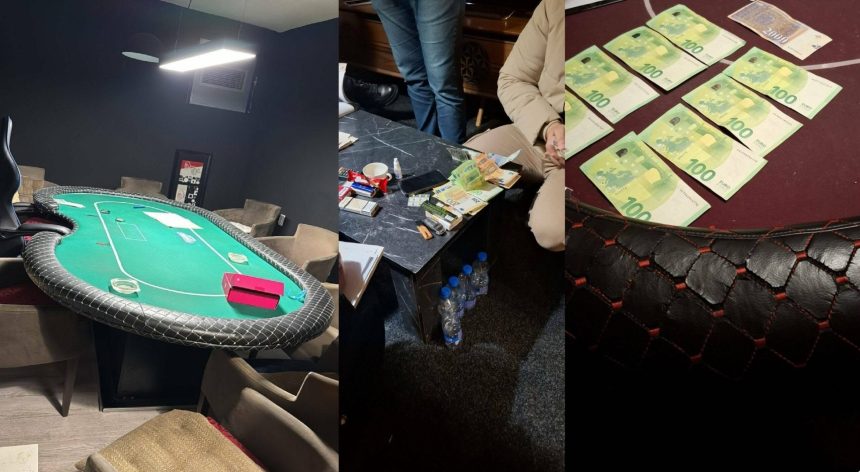 При вчерашна полициска акција во доцните часови, биле извршени претреси на повеќе локации, при што биле пронајдени поголеми парични средства, како и опрема за коцкање, вклучувајќи маси за покер, чипови и карти.