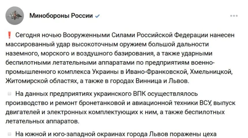 Според соопштението на руската војска синоќа бил извршрн масовен напад врз воено-индустриски цели во Западна Украина, вклучително и со борбени беспилотни летала.
