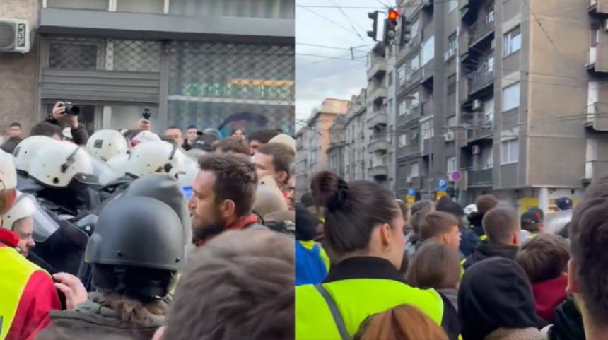 Пред централниот објект на РТС во центарот на Белград студенти во блоакда и граѓани со свирчиња и вувузели изразуваа незадоволство од работата на Јавниот сервис.