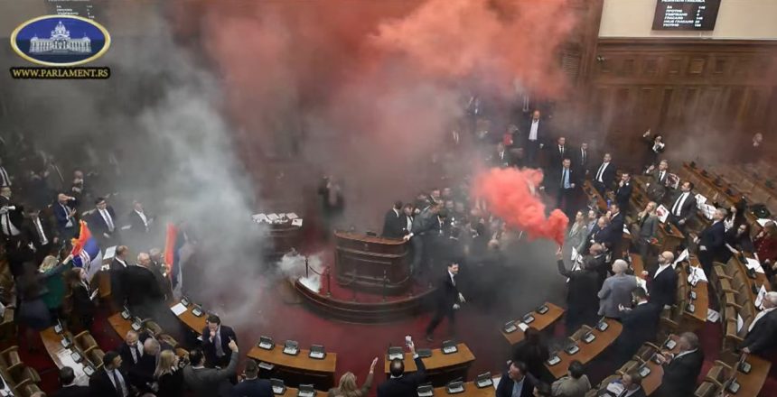 Седницата на Собранието на Србија беше прекината откако опозициските пратеници ја напуштија салата, притоа активирајќи пиротехнички средства.