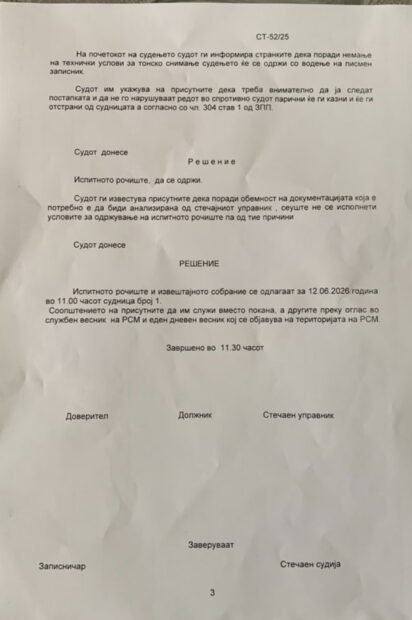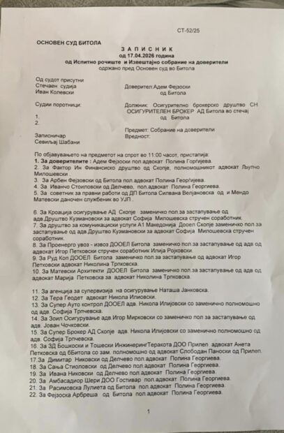 Рочиштето од 17 април 2026 пред Основен суд Битола само ги продлабочи прашањата со кои нашата редакција се занимава од ноември 2025 година. Одложувањето на испитното рочиште за 12 јуни 2026 дојде откако Охридскај однапред предупреди дека истото ќе биде одложено. Но клучниот проблем не е роковникот , туку она што се случува зад затворени врати.