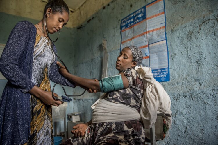 Editorial use only Birth attendant at the Yifa Health centre in the Libo Kemekem area, a district in the Amhara region of Ethiopia, examining a pregnant woman and advising on health issues. She educates them on risks associated with home births.,Image: 827122253, License: Rights-managed, Restrictions: Editorial use only, Model Release: no, Credit line: KAREN KASMAUSKI / Sciencephoto / Profimedia