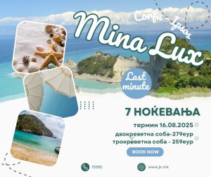 trending_flat Бизнис ЈК Травел: LAST MINUTE – КРФ – ИПСОС Термин: 16.08.2025 / 7 ноќевања Lorita August 12, 2025