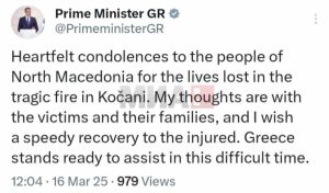 trending_flat Македонија Радев и Мицотакис изразија сочувство до семејствата на жртвите Lorita March 16, 2025