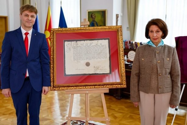 Професор Георги Гоце Дуртаноски, експерт за христијанска палеографија, денеска ѝ врачи на претседателката Гордана Сиљановска-Давкова во нејзиниот кабинет копија од…