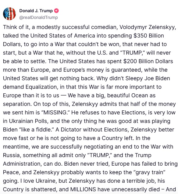 „Замислете, најуспешниот комичар, Володимир Зеленски, успеа да ги убеди САД да потрошат 350 милијарди долари за да влезат во војна во која не можат да победат, што никогаш не требаше да се случи. Сепак, тоа е војна што без Америка и Трамп никогаш не можеше да се реши. САД потрошија околу 200 милијарди долари повеќе од Европа, нивните пари се загарантирани, додека САД нема да добијат ништо. Зошто заспаниот Џо Бајден не бараше реми, со оглед на тоа дека оваа војна е далеку поважна за Европа отколку за нас. Имаме голем, прекрасен океан кој нè разделува. На крајот од сето тоа, Зеленски призна дека половина од парите што ги испративме исчезнале. Тој одбива да одржи избори, има мала поддршка и единственото нешто во што е добар е „вртење на Бајден околу малиот прст“, напиша Трамп.