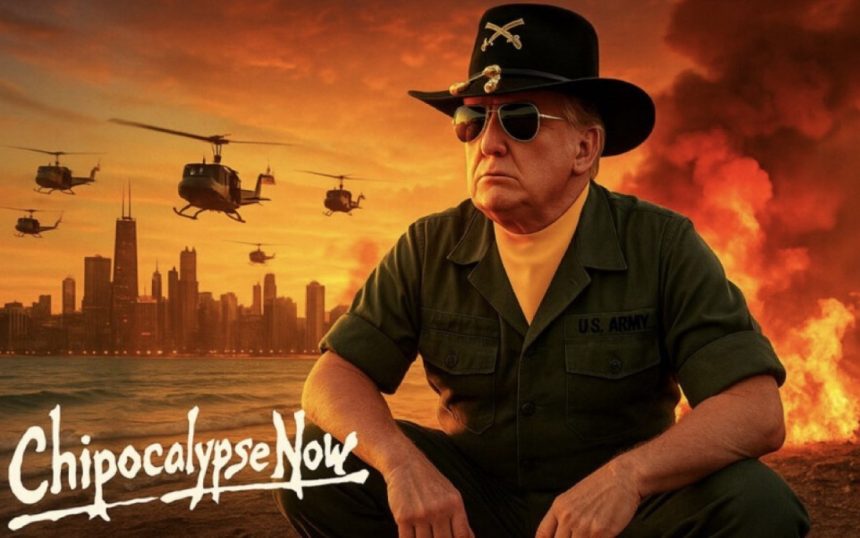 Американскиот претседател Доналд Трамп ја повтори својата намера да ја испрати Националната гарда во третиот по големина град во САД за да се справи со илегалните миграции пишувајќи дека го сака мирисот на депортации наутро. Под неговата објава стои шеговита фотомонтажа на која тој е прикажан како полковник Килгор од култниот филм „Апокалипса сега“ покрај градот Чикаго над кој летаат хеликоптери.