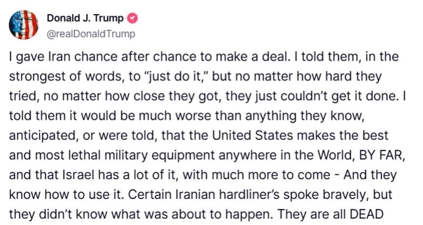 „Му дадов повеќе шанси на Иран да склучи договор. Им реков, со најемпатични зборови, „Само направете го тоа“. Но, без разлика колку се трудеа, без разлика колку се приближуваа до потпис, едноставно не можеа. Ги предупредив дека ќе биде многу полошо отколку што си замислуваа, очекуваа или им беше кажано, дека Соединетите Држави произведуваат најдобро и најсмртоносно оружје во светот, убедливо, и дека Израел има многу од овие оружја, а дека наскоро ќе има уште повеќе. И тие знаат како да ги користат. Некои тврдокорни во Иран зборуваа смело, но не знаеја што ги чека. СИТЕ СЕ МРТВИ сега – и ќе стане полошо! Веќе има многу смрт и уништување, но сè уште има време да се запре овој масакр, бидејќи следните напади што се веќе планирани ќе бидат уште побрутални. Иран мора да склучи договор, пред да остане ништо и да го спаси она што некогаш беше познато како Иранска империја. Крај на смртта, крај на уништувањето – САМО НАПРАВЕТЕ ГО ТОА, ПРЕД ДА БИДЕ ПРЕДОЦНА. Бог нека ве благослови сите вас“, објави Трамп на неговата социјална мрежа Truth Social.