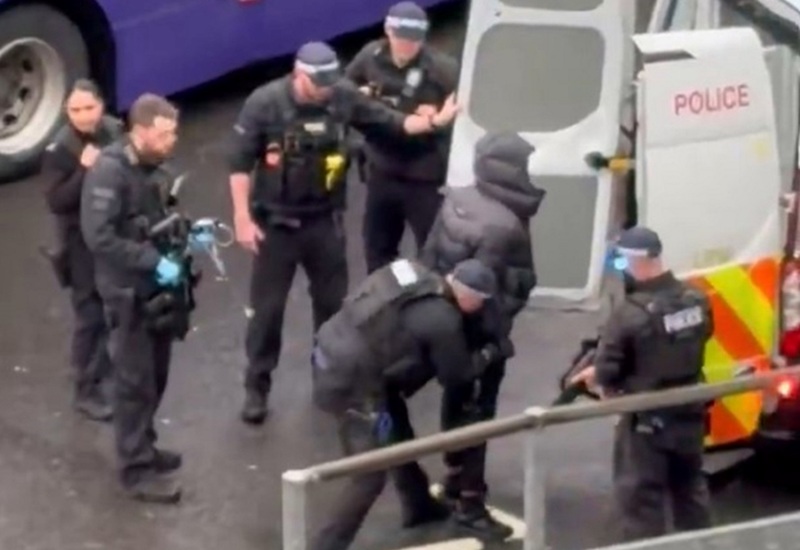 Драматични снимки што се појавија на социјалните мрежи покажуваат како маж со качулка е воден во полициско комбе од страна на полицајци со лисици.
