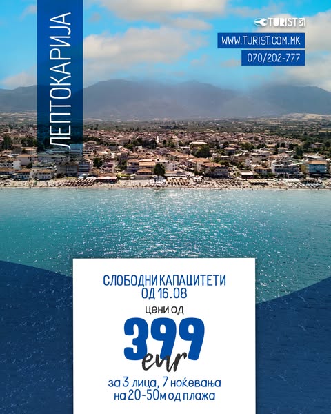 Туристичка Агенција – Турист Битола: Лептокарија лето 2025, Слободни капацитети од 16.08 со цени од 399 евра за 3 лица, 7 ноќевања на 20-50м од плажа