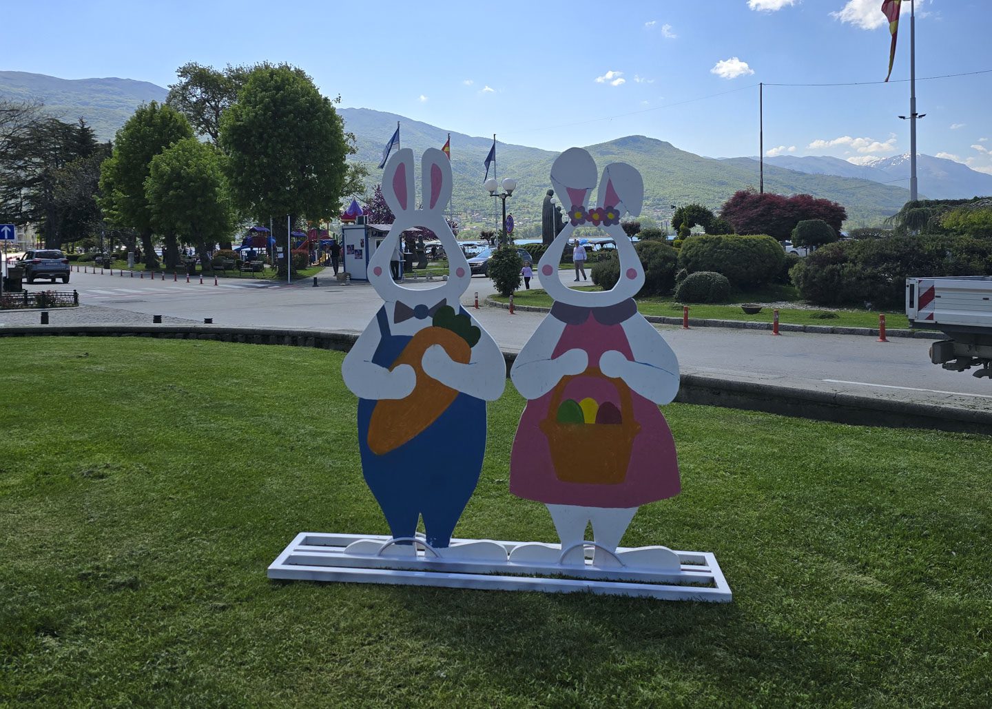 Денеска на плоштадот Свети Климент Охридски бше поставено великденско украсно јајце со христијанскиот поздрав Христос Воскресе, две дрвени клупи и други реквизити наменети за најмладите .