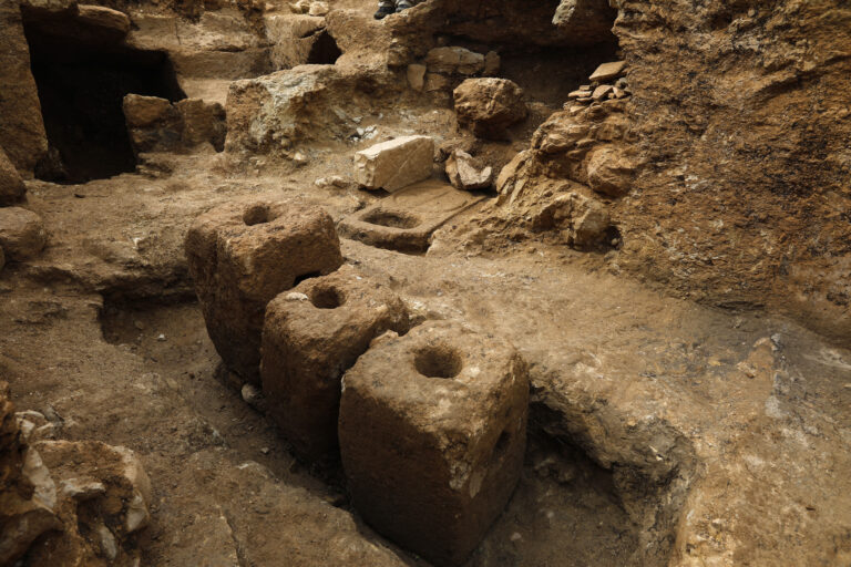 A picture taken on March 27, 2019 shows weight stones that were part of an ancient olive press at the site of the remains of a Jewish village from the Hasmonean period (approximately 2000-years-old), which are currently being uncovered by the Israel Antiquities Authority (IAA), in the Sharafat neighborhood of Jerusalem. (Photo by MENAHEM KAHANA / AFP)