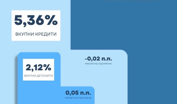 Просечната каматна стапка на вкупните кредити, во ноември 2024 година, годишен пад од и 0,12 п.п., и изнесува 5,36%. Просечната каматна стапка на вкупните депозити, пак, изнесува 2,12% и е зголемена за 0,38 п.п. на годишно ниво, соопшти Народната банка.