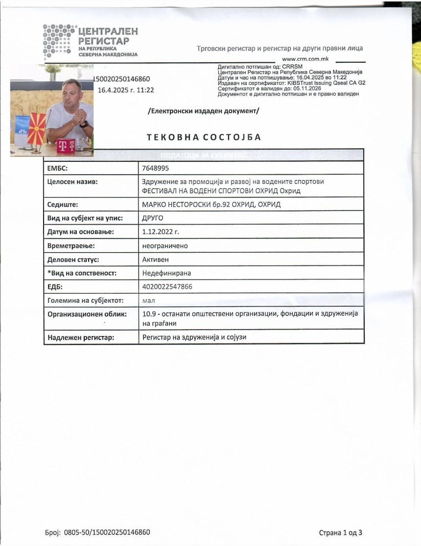 И така, како од вода изникна здружението за промоција и развој на водените спортови “ФЕСТИВАЛ НА ВОДЕНИ СПОРТОВИ Охрид” – организација која со метеорска брзина успеа да инкасира 3.349.250 денари од буџетот на градот за само десет дена фестивал! А за изненадување на сите финансиски стручњаци, оваа сума до последен денар се претворила во расход. Совршен баланс што би го натерал и Архимедовиот закон да го преиспита своето постоење!