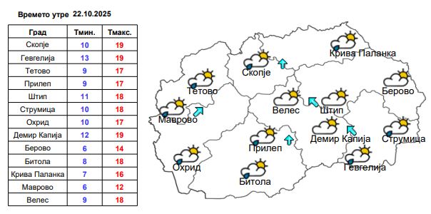 Температурата ќе се движи од 10 до 19 степени.