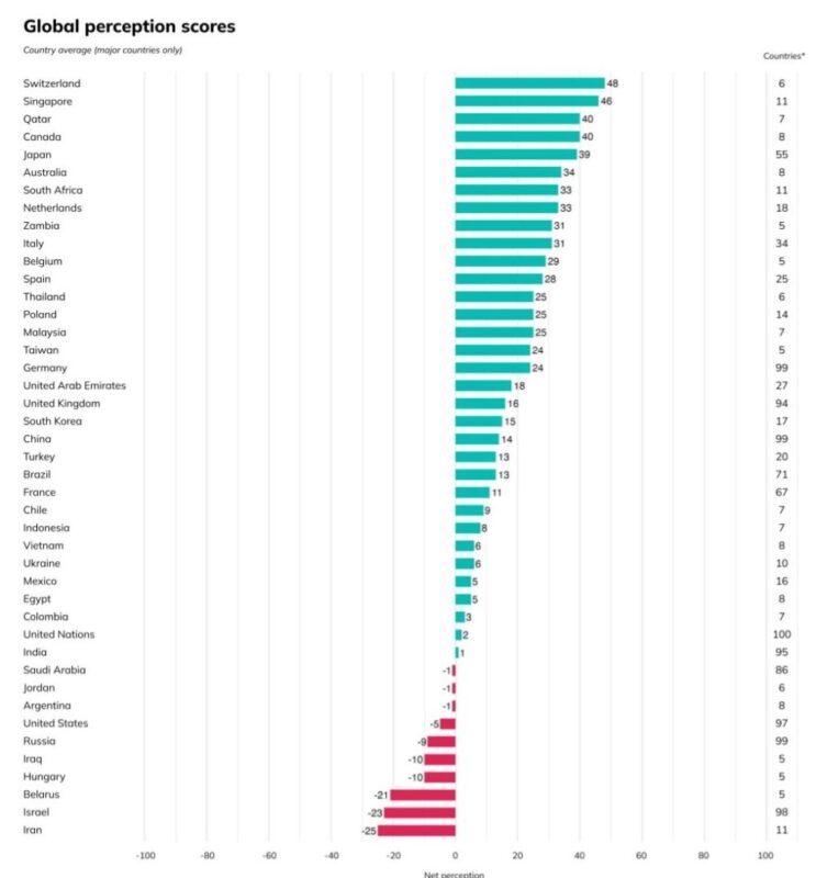 Од друга страна, Русија, чиј меѓународен углед го допре дното по окупацијата на Украина во 2022 година, сè уште е рангирана малку полошо од САД, но исто така бележи мали подобрувања.