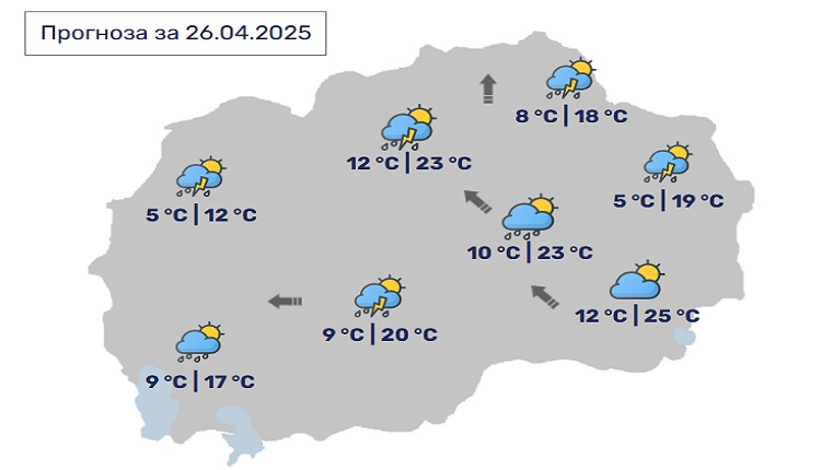 Во Скопје, времето ќе биде променливо облачно, а во делови од котлината ќе преовладува нестабилност со пороен дожд, грмежи и засилен ветер. Постои можност за изолирани случаи на град.