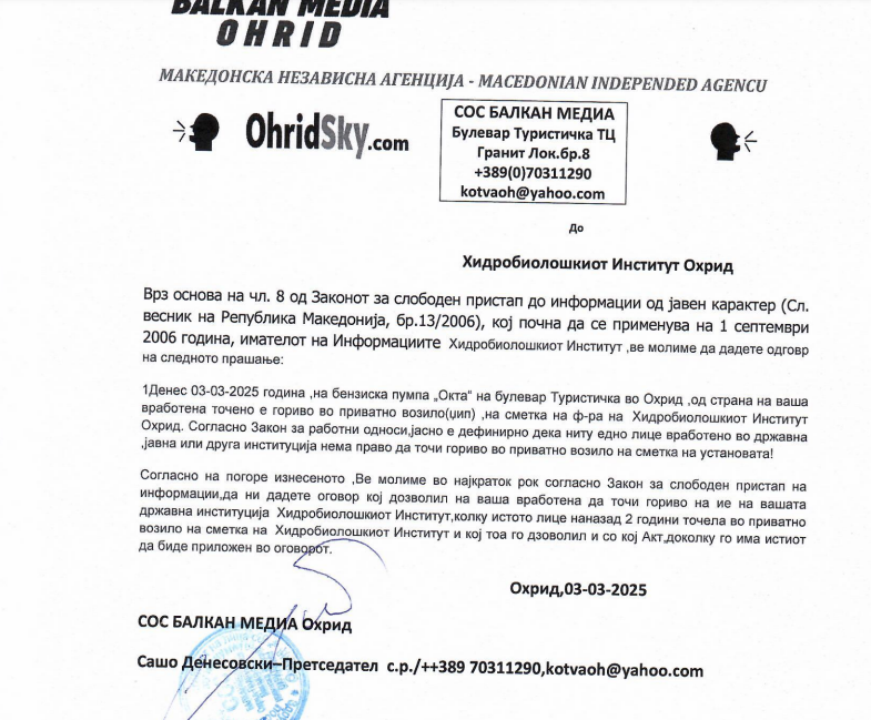 Прилог:Испратено барање за достава на инфорации од јавен карактер до ЈУ Хидробиолошки институт Охрид: